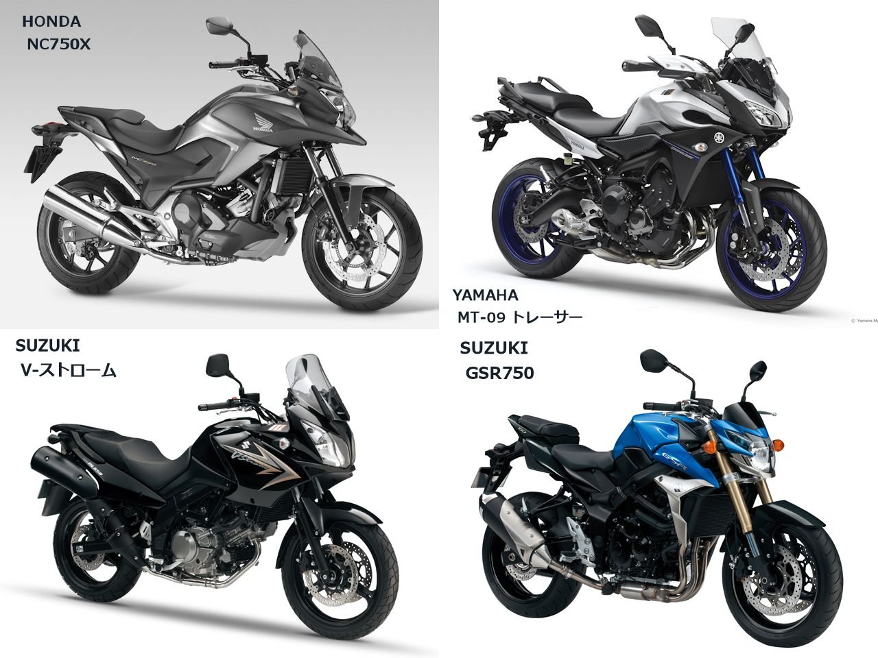 ホンダNC750、ヤマハMT-09、スズキだとGSR750かVストローム、カワサキは…Versysくらいか?