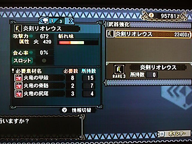 そんな訳で、早々と素材が揃ってしまったので、早速大剣の強化をしてみました。