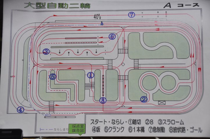 バイクは前ブレーキをかけると、前のめり(前輪荷重)になり後輪が抜けてしまうので、その状態で後ブレーキをかけると、後輪は容易くロックしてしまいます。この課題では、ホイールをロックさせると大きな減点になってしまうので(確か-20点くらい?)、ロックさせないブレーキングが必要です。