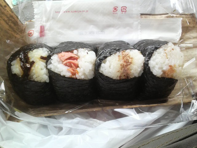右から「梅」、「おかか」、「しゃけ」、「昆布」。