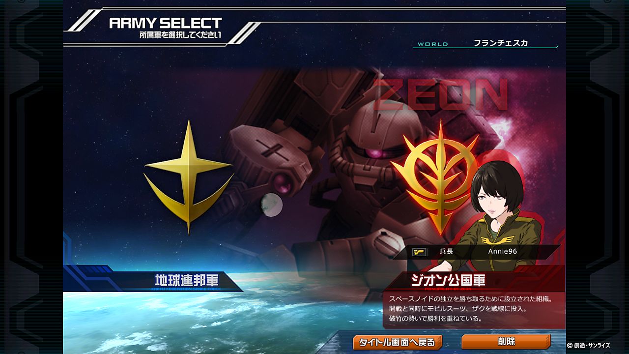 ジオン軍だとシャアザク、連邦軍だとガンダムがバックに映し出されます。