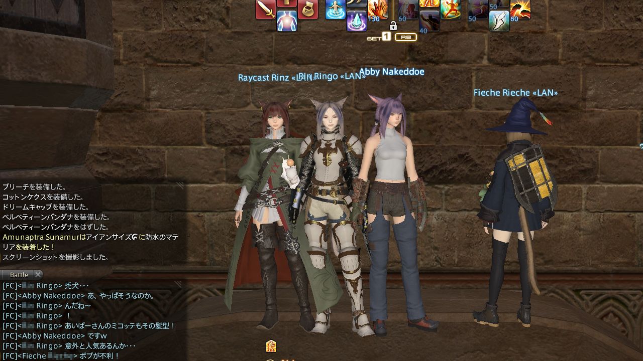 図らずも、ミコッテだらけのなった時のこと、リンゴさんとレイさん、それに雌鹿の髪型が同じことが判明。