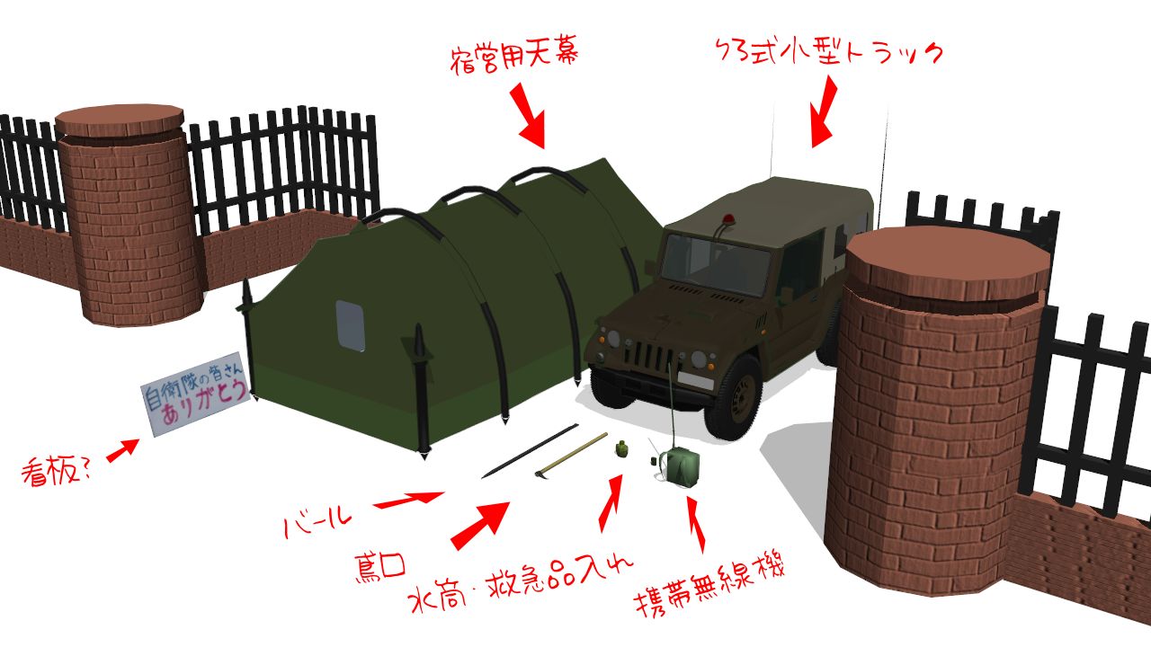 宿営用天幕は並べて宿営地を再現するシーンがあったので、外側まで作ったのですが、
