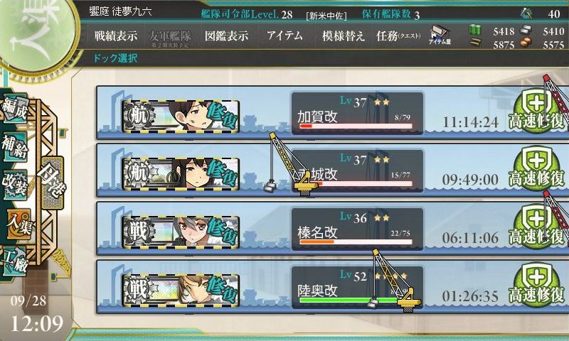 損傷した艦艇を、高速修復材なしで入渠させてみた。