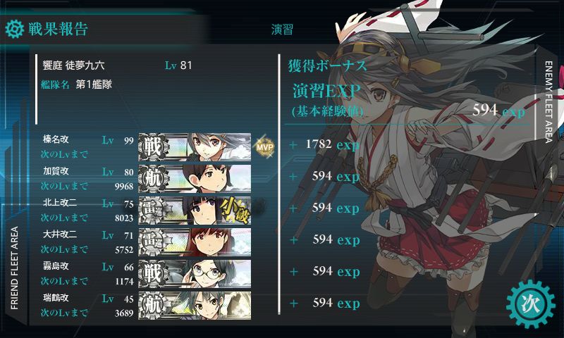 改二が実装されるまで、ほとんど育ててなかった霧島も…。