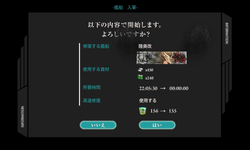 ちなみにSSのむっちゃんは、バケツを使わなかったら、入渠22時間。