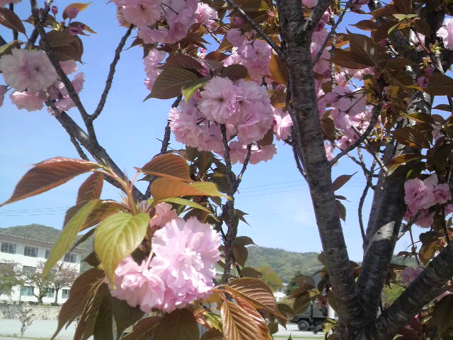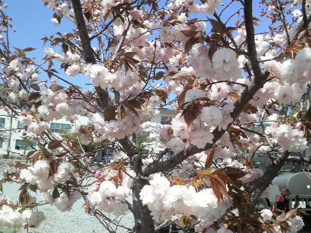 八重桜は遠くで見るとピンクがきつく見えて