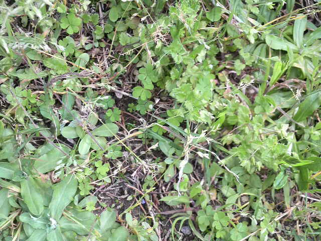 オオバコとかセリにまぎれて、小さなハート型の葉っぱを開いているカタバミを見つけました。ただ、残念ながらココのカタバミは花をつけてませんね。