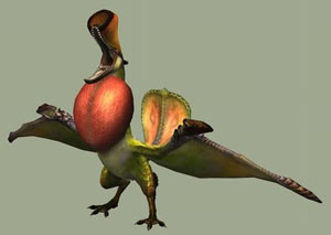 「独特な色彩を持った、中型の鳥竜種。胸元と頭部に備わる発声器官を使い様々なモンスターの鳴きマネを行うことで有名。危険を感じると、飛竜などの声色をマネて呼び、隙を見て逃げようとする。可燃性の液体を吐きつけてくるので注意が必要。別名“彩鳥”。」