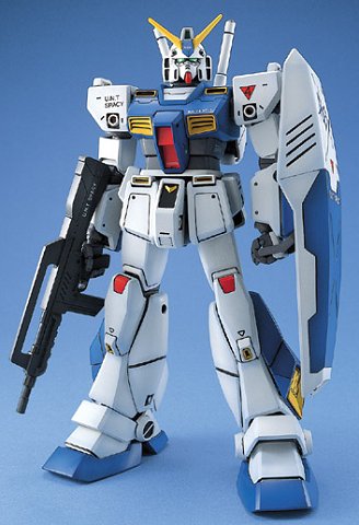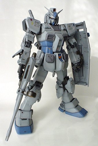 ガンダム3号仕様機。2号機の予備パーツとして、解体されてホワイトベースに積載されてた機体。ジャブローでWBが補給を受けた際、降ろされてマグネットコーティングのテスト運用にまわされた。G3が灰色なのは、このコーティング材のせいらしいが、アニメではマグネットコーティングされた2号機が、トリコロールカラーのままなので、きっと改良が加えられたのであろう。
