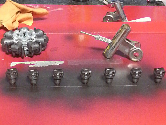 とある作例で、シリンダーヘッドをつや消し黒で下塗りして、焼鉄色をドライブラシするというのがありました。これなら墨入れする必要もなく、良い色合いに仕上がりますな…私もそうすれば良かった(´_`。)