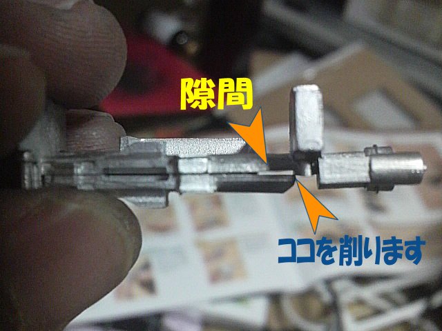 この後、機銃取付けバーと銃身部分を仮組みしたのですが、ここもお互いに干渉して銃身が真っ直ぐ取り付けられません。銃身の取付けバーに当たってしまう箇所を0.5mm削ることになりました。