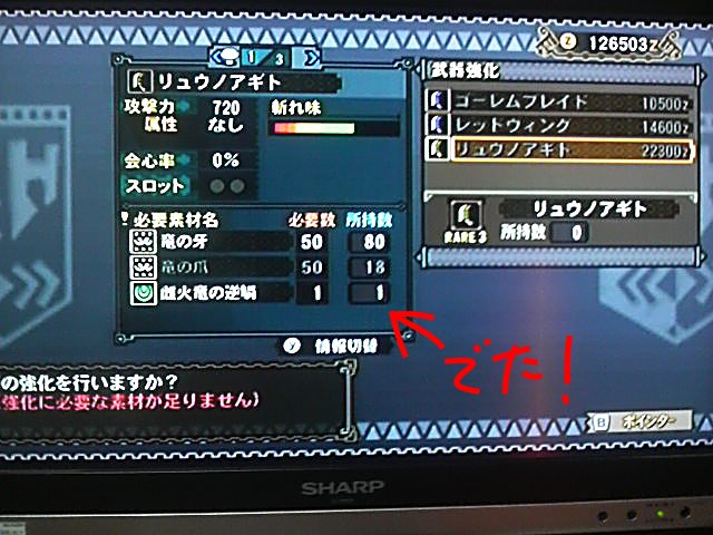 強化しようとしてる大剣に、竜の牙×50、竜の爪×50、雌火竜の逆鱗×1が必要なのです。