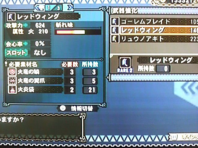 レッドウィングに強化するだけの素材はあったようですが、リュウノアギト作るつもりだったしな~。