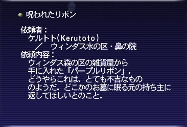 リボンクエは、何であんな所に?とか、あのリボンの色ってまさか…。とかアレコレ考えてたから背筋がゾッとするクエでしたな(・ω・)