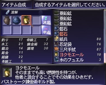 合成素材は、水クリ、スライムオイル、藍石、ヨクモエール。