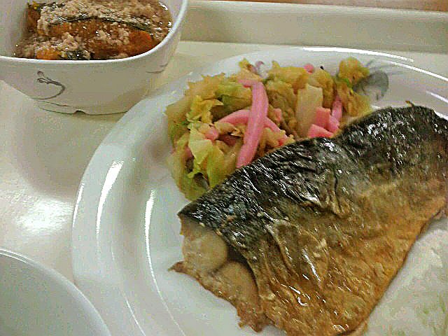 1日の昼飯は、塩鯖。塩加減とか、いい塩梅です♪
