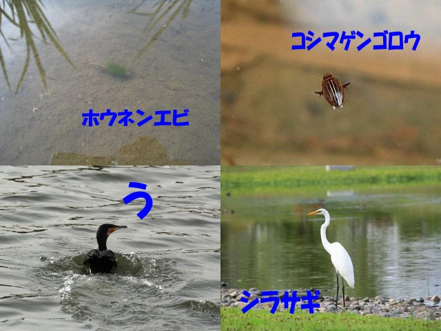シラサギやアオサギがのんびり歩き回り、鵜が忙しなく潜ったり浮かんだりw