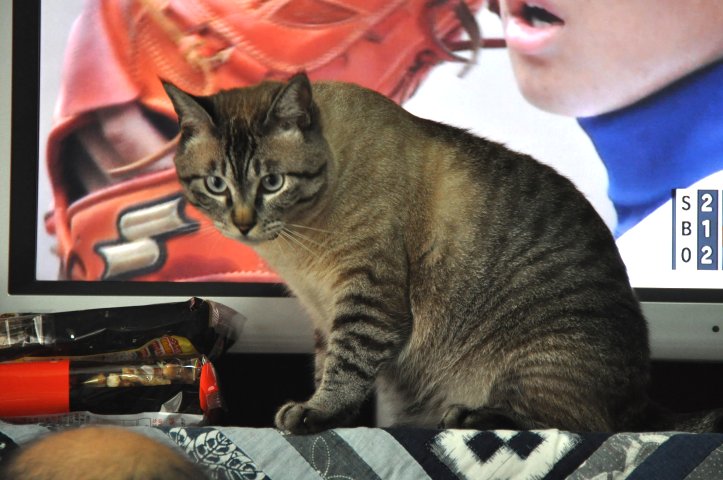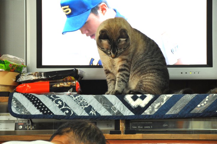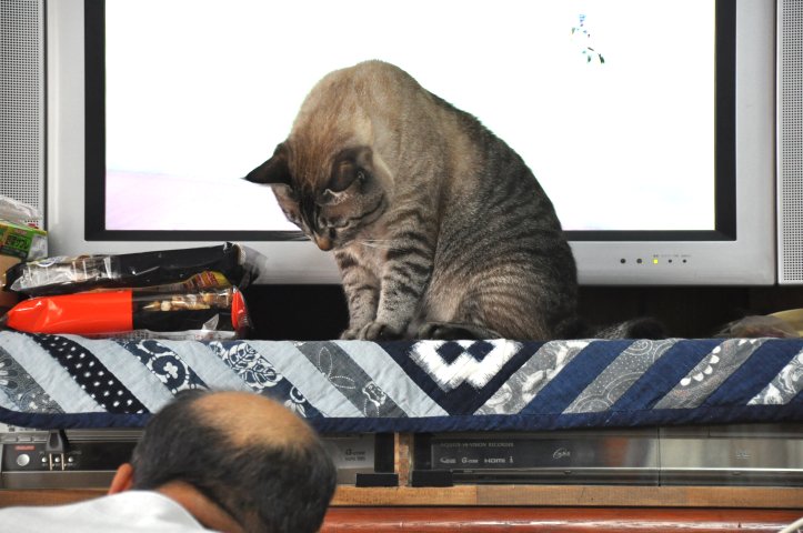 親父がTV横の棚に、マタタビ入りの何かをしまってるらしく、チャムはそれを期待していたようです。