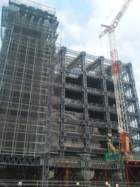 東側には資材搬入用のエレベーターがあり、↑は丁度そのエレベーターが下りているところでした。