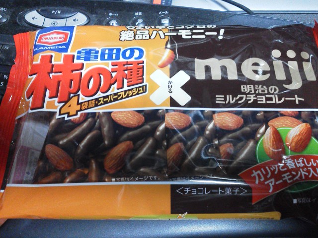 亀田製菓と明治製菓のコラボレーション商品、「亀田の柿の種×明治のミルクチョコレート」。