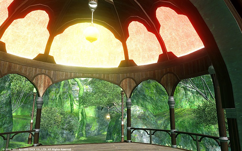 ランタンの光と天蓋を通した陽光が、ハレーションっぽくなっています。