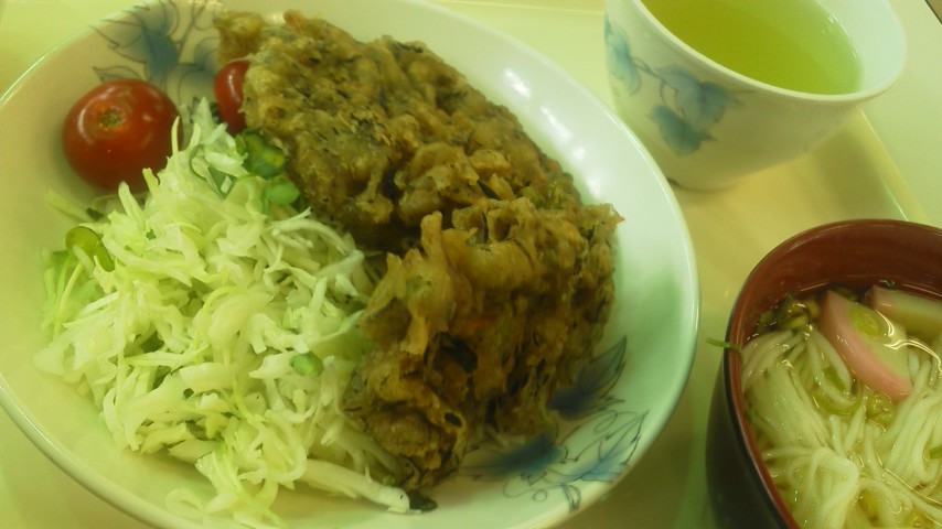 昼飯は、枝豆と海老とヒジキのかき揚げ。