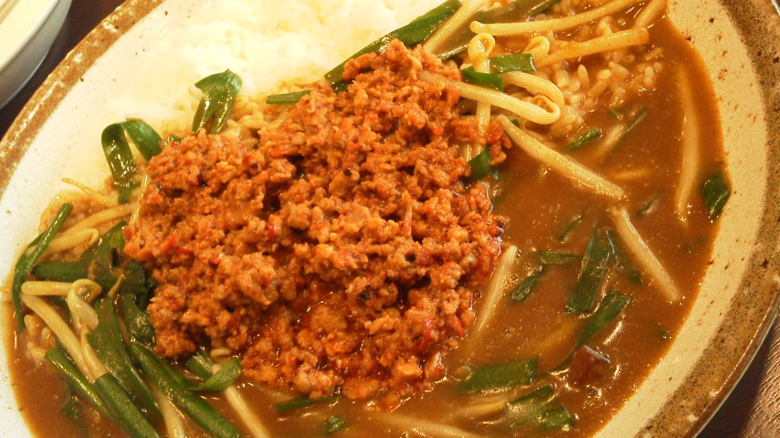味のほうは、辛肉味噌が割りと強いような、それでもカレーは負けてないような、